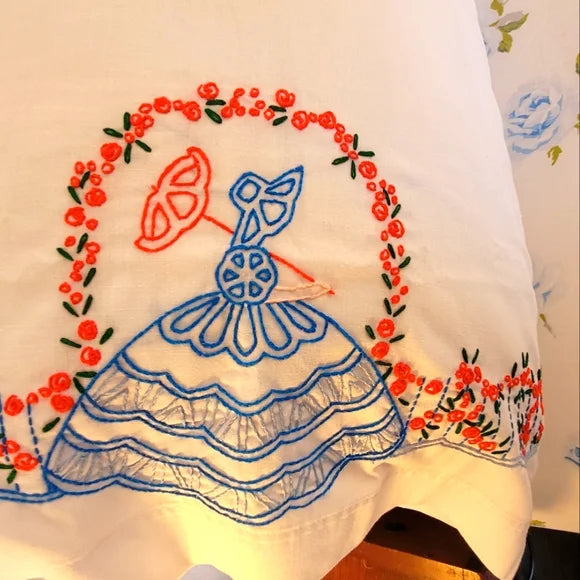 2 x pillowcases with hand embroidery. No maker or content tag but thick and crisp, feels like cotton for sure. Nice euro vibes with these.